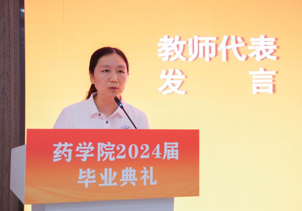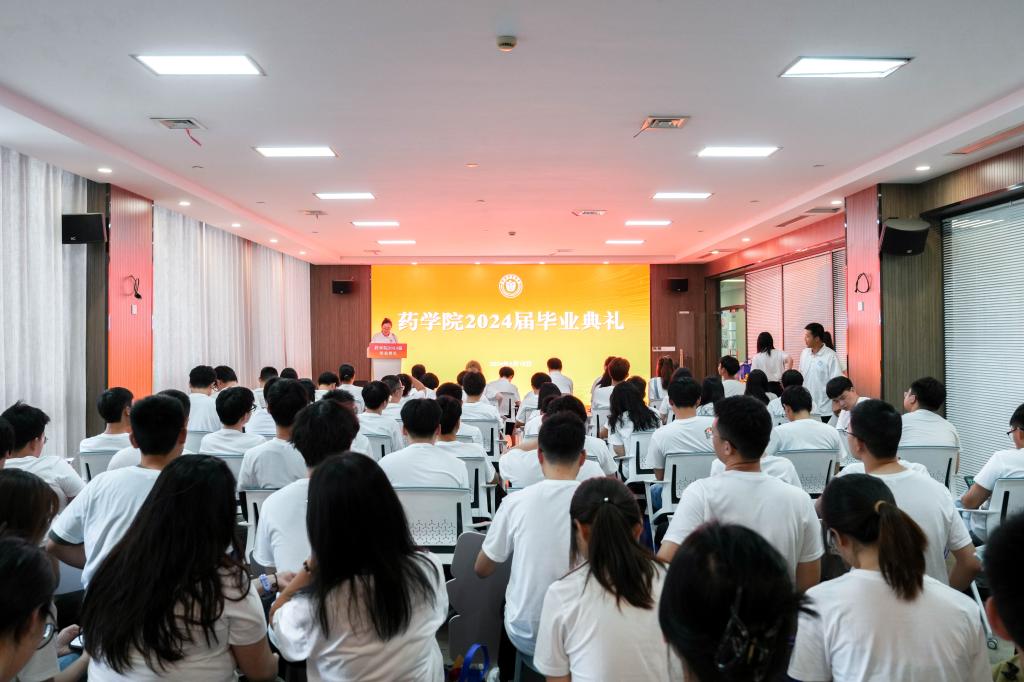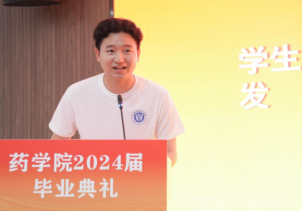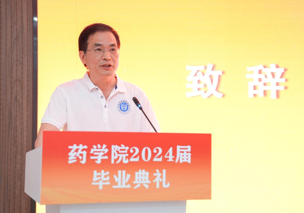 如何更好地步入更为广阔的天地,胡金锋与现场每位毕业生分享了希望与期许:一是保持学习的热情。知识更新换代的速度远超我们的想象,唯有不断学习,才能紧跟时代的步伐。希望你们能持续关注药学领域的最新发展,不断提升自己的专业素养和技能水平。二是勇于承担责任。“明道弘药、和合济世”,作为药学专业的毕业生,你们肩负着人们的生命健康的重担。在未来的工作中,希望你们能始终坚守职业道德,为保障药品安全、提高公众健康水平贡献自己的力量。三是坚持创新精神。在科学研究和实际应用中,创新是推动进步的关键力量。希望你们敢于质疑传统,勇于探索未知,用创新的思维和方法解决实际问题。四要有诗和远方。厚植家国情怀,永怀感恩之心,有梦想、懂浪漫,学会欣赏,善于发现美、追求美!