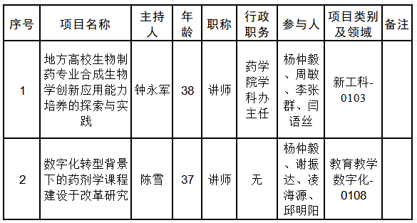根据教务处《关于开展省级“十四五”第二批本科和研究生教学项目申报工作的通知》(台公司教发〔2024〕137号)文件要求,公司组织了“十四五”第二批本科和研究生省级教学改革项目遴选、推荐工作。根据专家评审结果,拟设立2项目为院培育项目,2年内若申请到校级及以上课题则算作自动结题,项目情况如下。