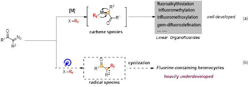 随着现代有机氟化学的兴起,人们愈发认识到氟原子、含氟官能团的引入能够增强药物在生物体内的稳定性、渗透性、脂溶性,有效增加药物的生物学活性,这使得有机氟化物成为药物研发中不可或缺的分子框架。然而令人遗憾的是,自然界中氟元素主要以无机物的形式存储,含氟有机杂环结构体通常无法自主合成,因此有机氟化物的简单高效合成方法的开发显得尤为重要。在过去的几十年里,重氮羰基化合物在过渡金属催化作用下或可见光照射条件下可作为卡宾前体,基于卡宾的原位捕获业已开发出许多新颖的反应类型,例如,在过渡金属的催化下,氟烷基化试剂与重氮羰基化合物可以转化为一系列结构优美的含氟结构骨架(图1a)。然而,在可见光的驱动下, 重氮羰基化合物与氟烷基化试剂通过自由基路径转化为脱氮的合成子,再进一步转化为一系列含氟氮杂环的反应却鲜有报道(图1b)。因此进一步开发重氮羰基化合物与氟烷基化试剂在光化学领域的自由基类型的环化反应来构筑复杂的含氟杂环是十分必要的。