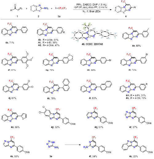 该团队开发了一种光化学策略来合成含三氟甲基取代的氮杂环。通过关键的氟烷基自由基的引入来实现重氮羰基化合物作为罕见的脱氮合成子。该反应在温和的可见光驱动条件下展示出良好的官能团耐受性,广泛的底物范围。目前该实验室正在对这种重氮/氟/自由基化学策略进行进一步研究,以合成更复杂的有机氟化物。