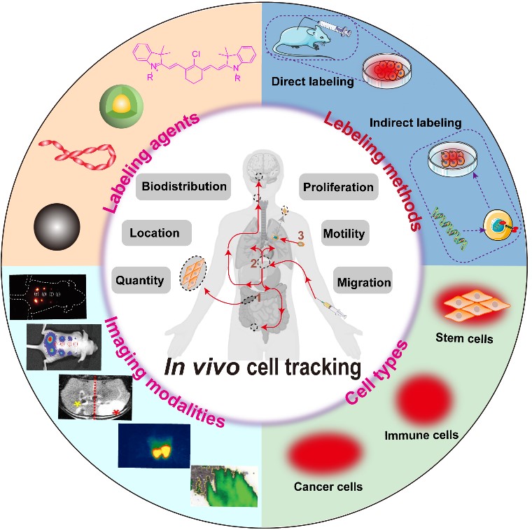 近些年,细胞治疗在现代生物医药领域正经历快速增长。而实时跟踪和检测移植后的细胞在活体内的命运和功能对于细胞疗法治疗效率的预测和评估以及探索生物系统的生理和病理过程发挥着至关重要的作用。非侵入式活体细胞追踪技术是一种新兴的成像方法,可以用于活体细胞追踪与检测,为直接探究细胞在生物体内的生理过程和病理机制研究提供了一种有效的方法。近红外光学成像(NIR,700-1700nm)因其具有多种内在固有的优势,如高灵敏度和高时空分辨率、实时方式、低成本和无电离辐射等,被认为是现代生物医学领域基础研究和临床实践中最具有应用发展前景的活体细胞跟踪与成像方式。