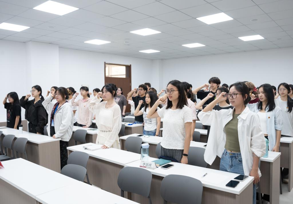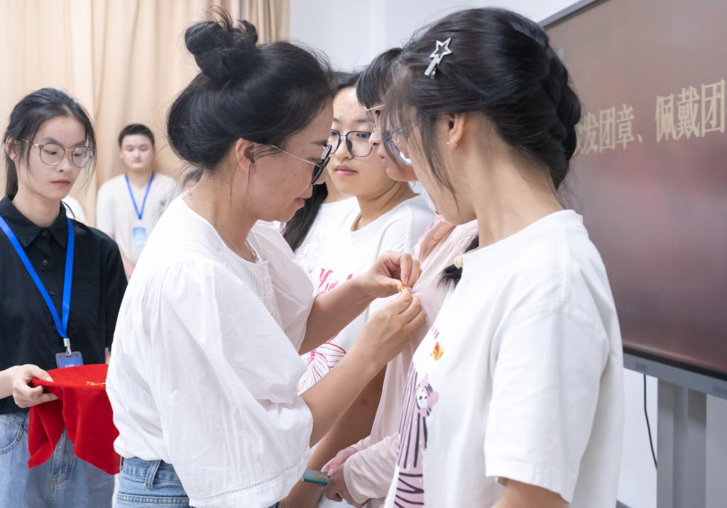 大会在激昂的团歌声中拉开帷幕。姚卓琳宣读新团员名单,并对公司15名新团员表示祝贺。随后,高阳为新团员颁发团章、佩戴团徽,一枚枚团徽闪耀,承载着责任与使命。新团员代表24药学班李勇、老团员代表23生物制药班邱佳豪分别发言,表达了将继续坚定信念、奋勇前行的决心。全体新团员在庄严宣誓中,许下为共产主义事业奋斗的铮铮誓言。