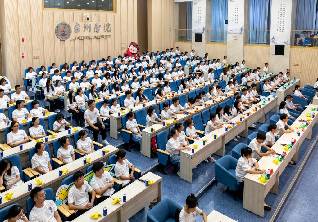 会议厅入口,“欢迎YAO新星”展板清新活泼,朝气蓬勃;典礼现场,三色风车和百事可乐按班级区域依次摆开,184名新生身着院服、佩戴院徽,相聚在此,共同开启大学新生活。