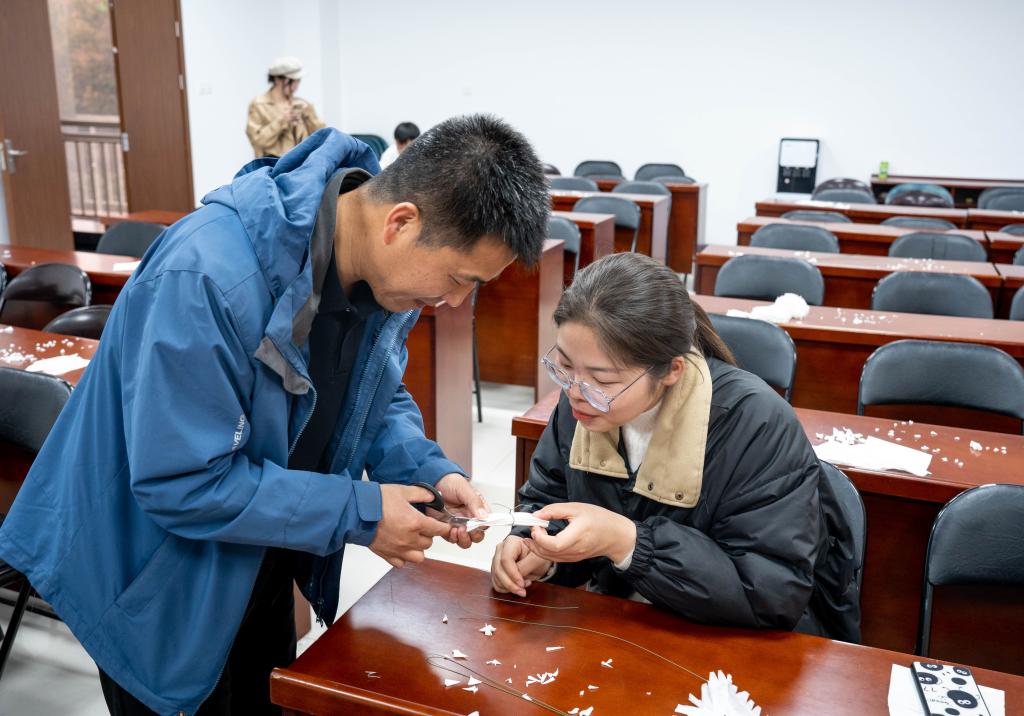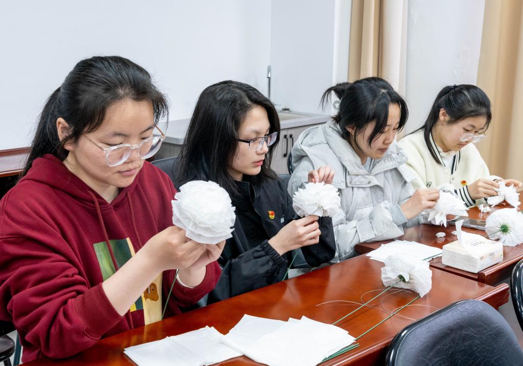 活动现场,员工们热情高涨,认真细致,纷纷投入身心于“扎花朵”中力求将每一朵花都做得无可挑剔。他们用手中的白纸、细线、剪刀等材料工具,精心制作出一朵朵洁白无暇的菊花一张张纸在同学们的手里变成一朵朵为先辈送上的花,在亲身制作中感受先烈的抛头颅洒热血的坚毅和无私,也在员工心中播下了红色基因的种子。