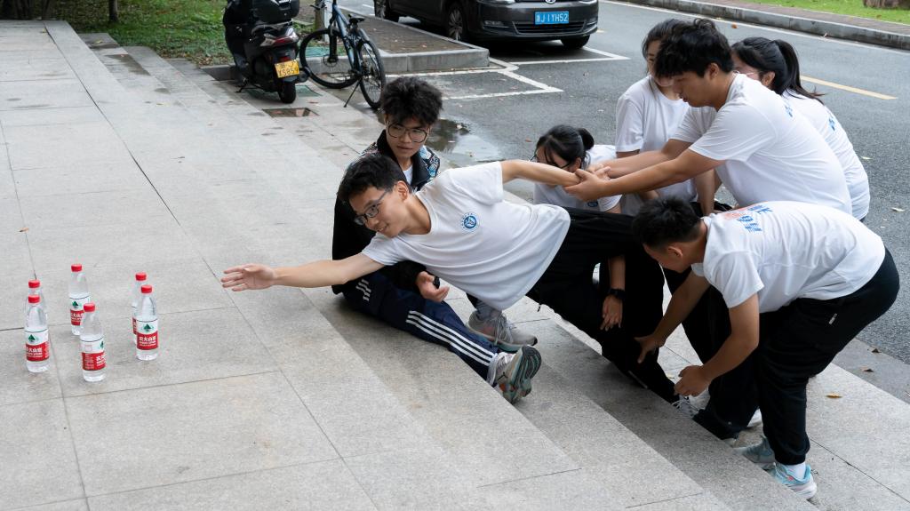接下来,五支队伍在校园内寻找五个地点,分别进行了单脚火车跑、纸牌接力、黄金矿工、绝地求生、串名字+踢毽子等五个富有趣味性且节奏轻快的游戏。宣传部干事章嘉斌表示:“游戏的难度不足挂齿,因为身后有队友的支持,前方便一路坦途。”组织部干事柯祺雄也提到:“素拓让各部门之间的干事们更加互相熟悉,加强了各部门的相互交流和共同合作。”