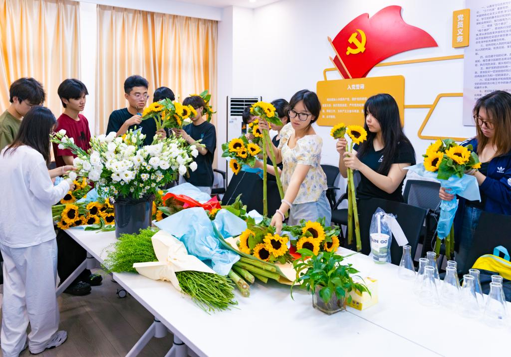 活动现场花香四溢,向日葵、洋甘菊、洋桔梗等鲜花与各类制作工具摆放整齐。在团学会青年志愿者协会会长何婷的带领下,大家修剪花枝、照图插花、整理花束、绑扎丝带……同学们相互配合搭配花材,精心设计花束造型,每一束花都包含着对毕业生的不舍与期许。